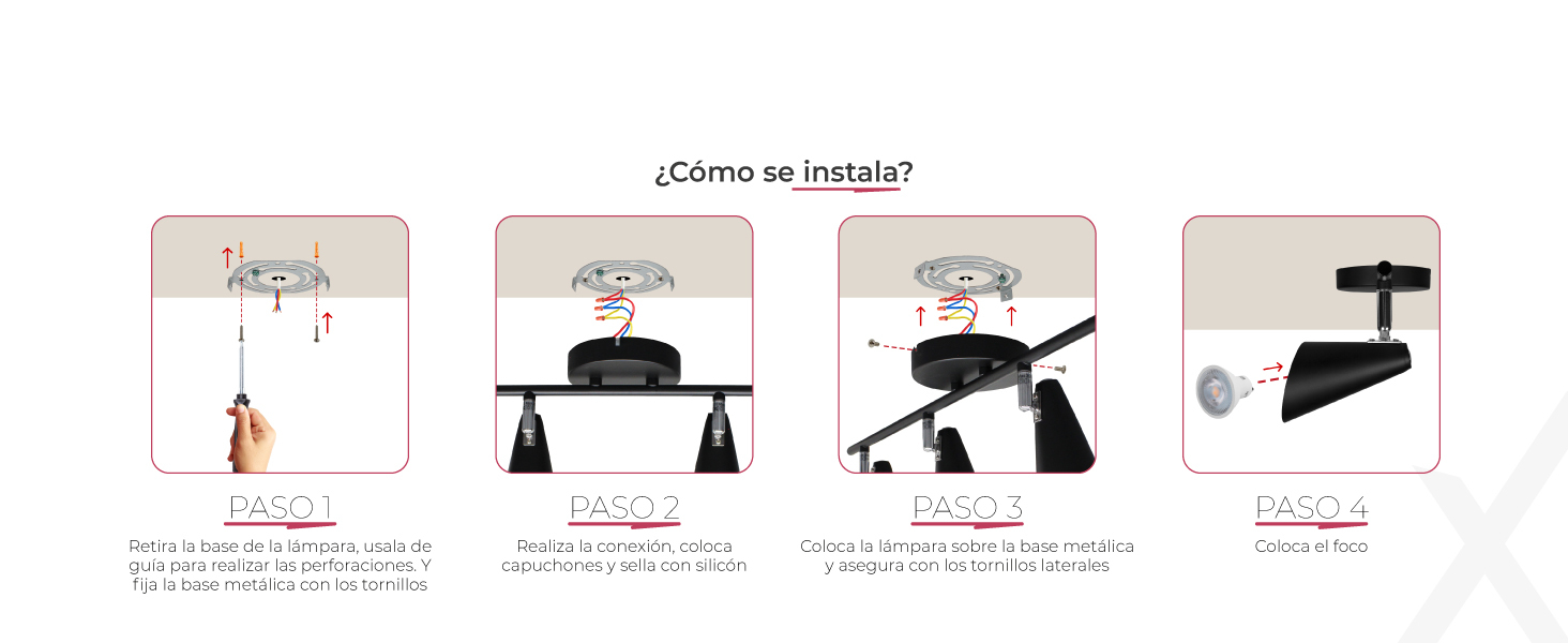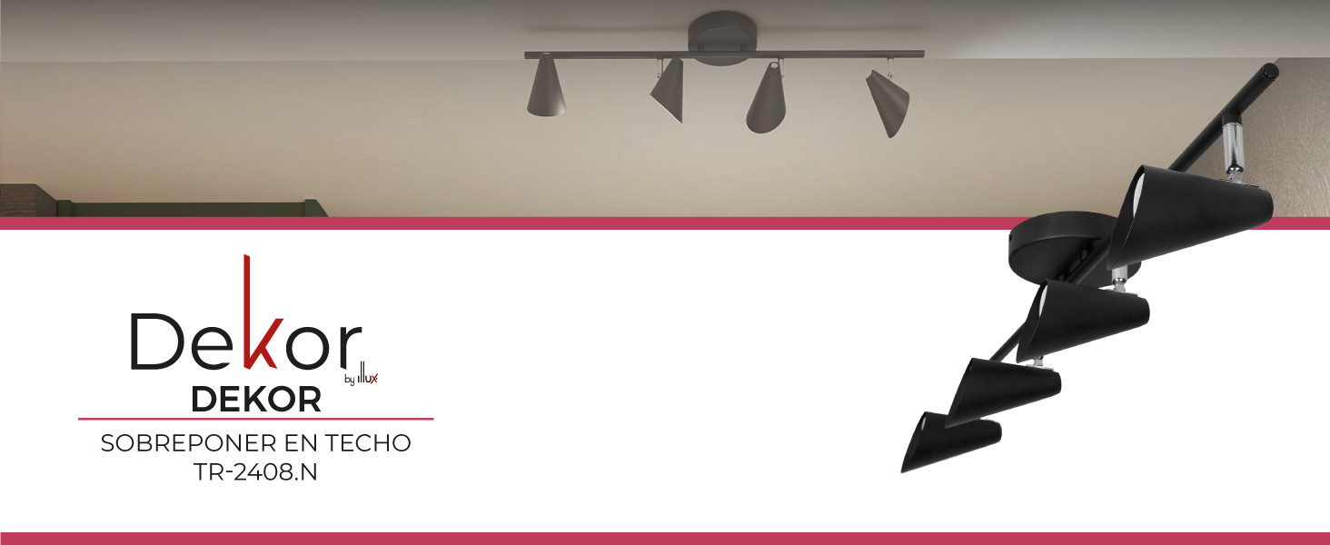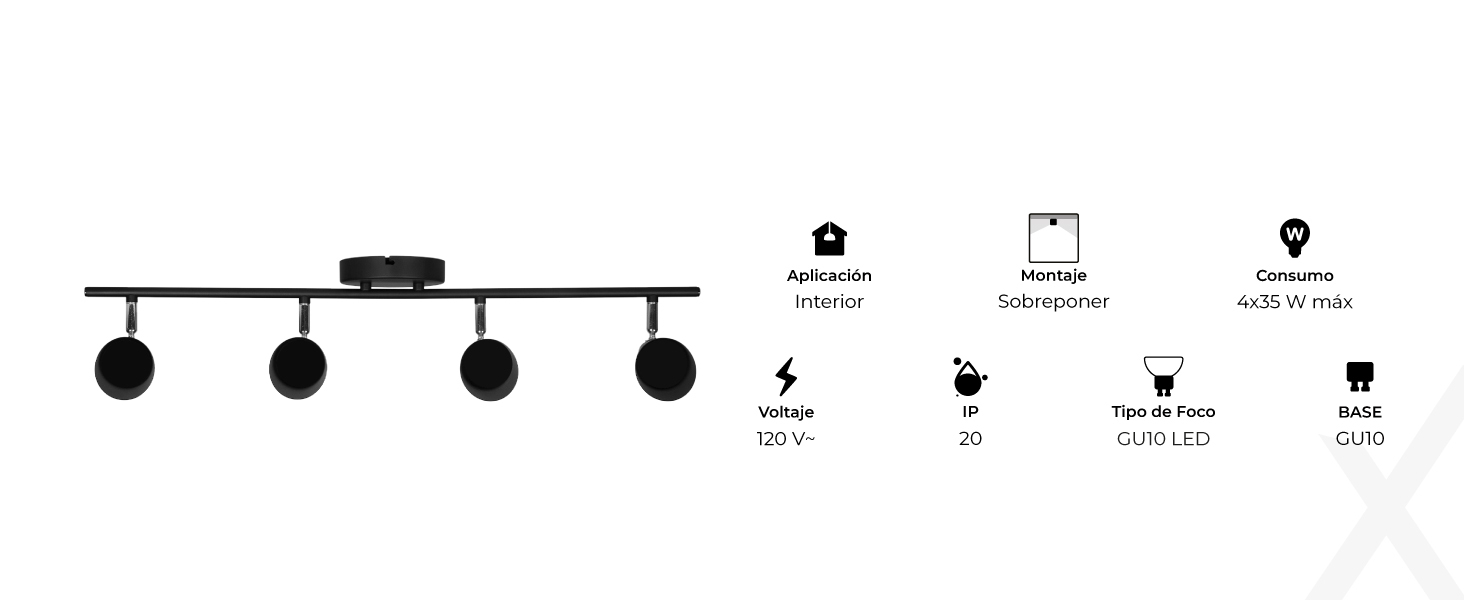 La luminaria TR-2408 presenta una potencia lumínica excepcional con su configuración de cuádruple spot, permitiendo la instalación de cuatro lámparas GU10 de hasta 35 W cada una para una iluminación completa y enfocada.