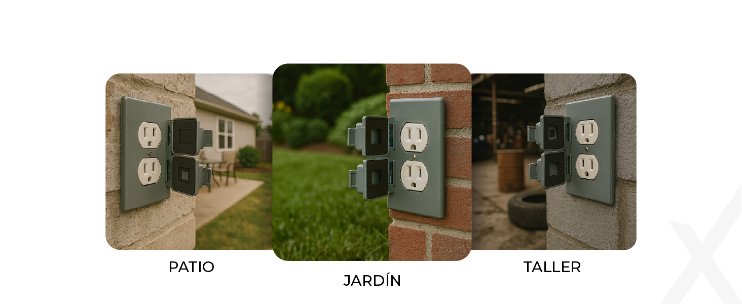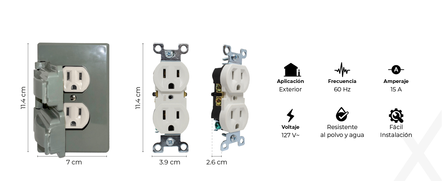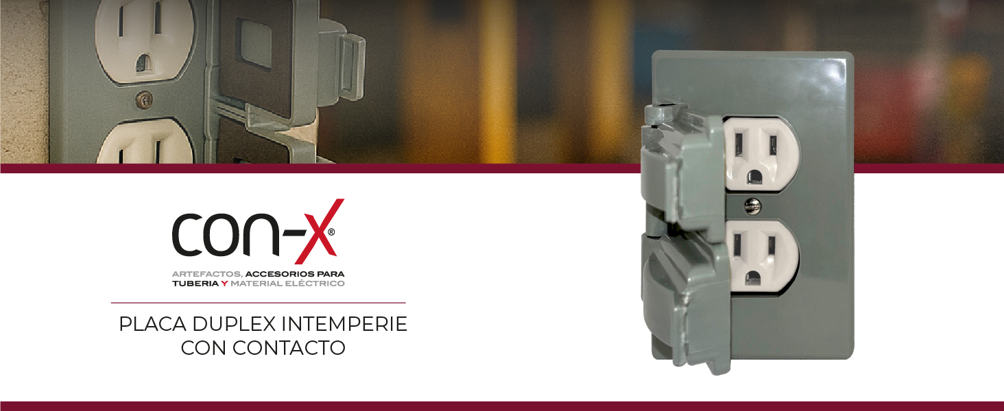 Placa dúplex diseñada especialmente para proteger tomacorrientes en áreas expuestas a la intemperie, brindando seguridad y durabilidad en ambientes exteriores.