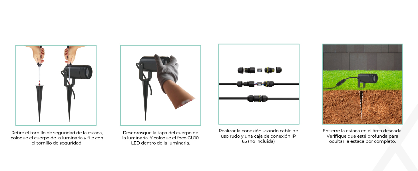Para mayor comodidad, este producto viene con una estaca que facilita su instalación en el suelo. Simplemente coloca la luminaria en la estaca y ajústala según tus necesidades de iluminación.