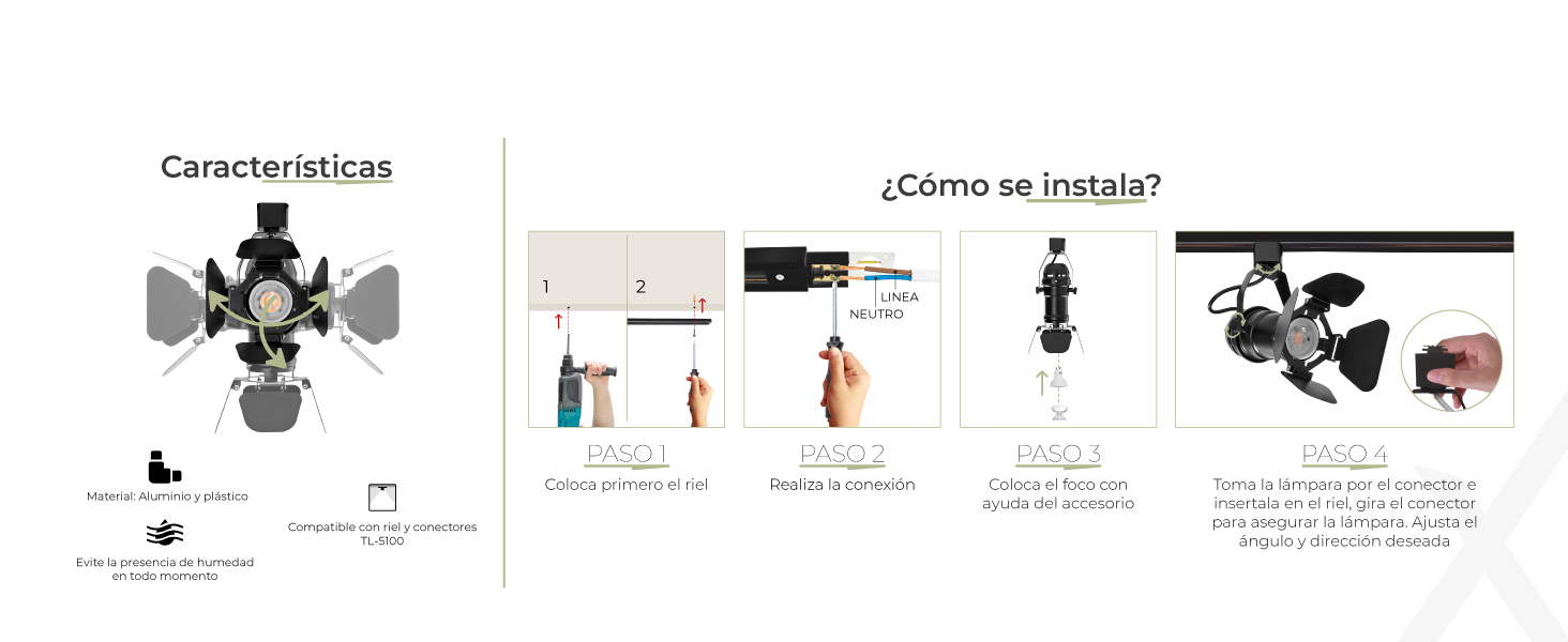 Nuestra luminaria para riel en techo cuenta con cortadores de luz, permitiéndote ajustar y dirigir el haz de luz de manera precisa. Ideal para tiendas de ropa, galerías, residencias y oficinas, esta luminaria te brinda la capacidad de resaltar elementos específicos o crear ambientes focalizados.