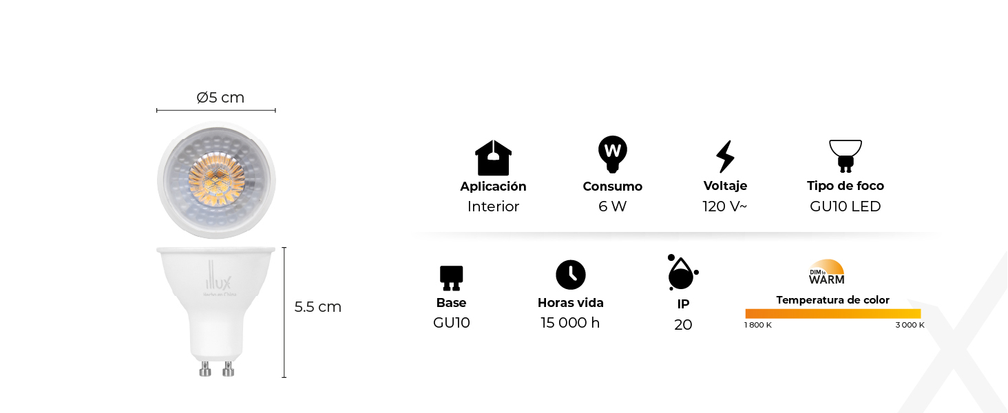 Acabado:BlancoMaterial:Aluminio plastificado, PolicarbonatoDimensiones:50×55 mmIP:20Peso:0.32 KgAtenuable:SíHoras de vida:15 000 hTipo de aislamiento:Clase IILámpara:SmaliteBase:GU10Corriente:0.05 AFactor de potencia:≥0.5Frecuencia:60 HzPotencia:6 WTemperatura de operación:-20 °C a +45 °CTensión:120 V~Ángulo de apertura:38°Flujo real:400 lmIRC:80Temperatura de color:DTW (1 800 K – 3 000 K) -