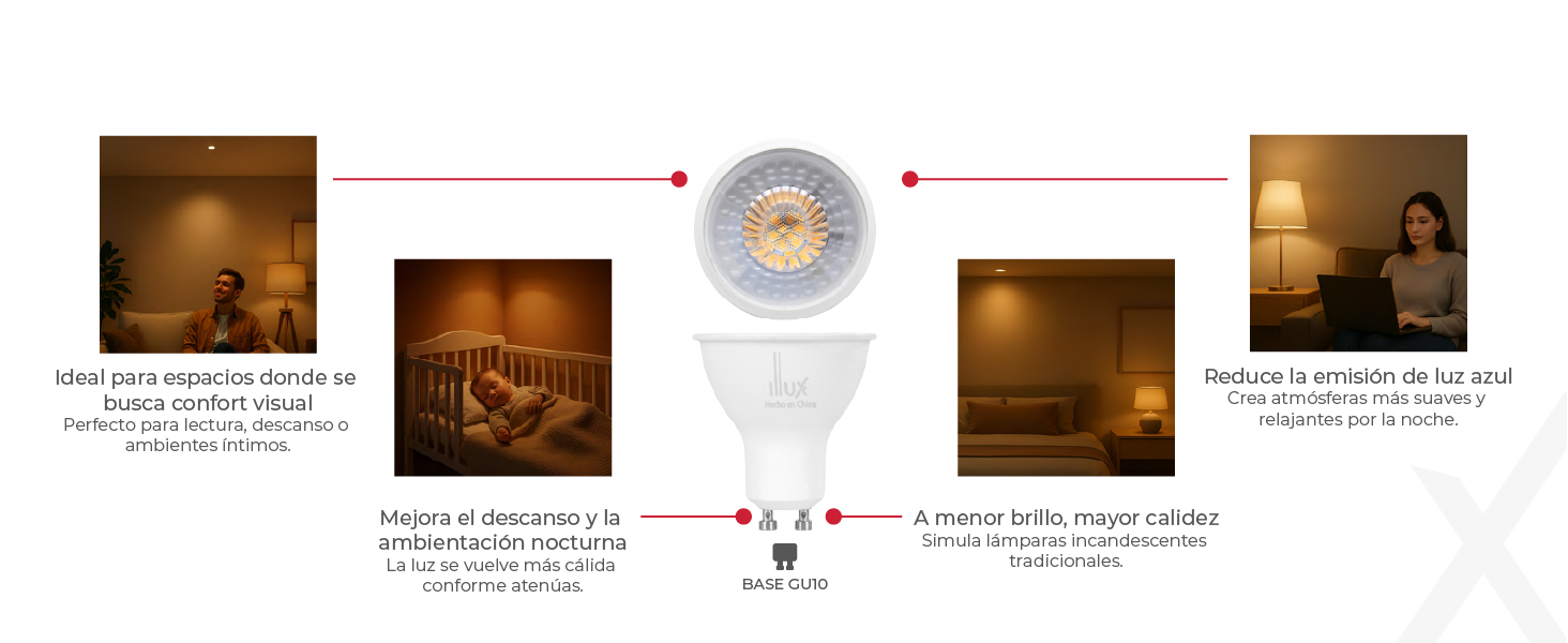 Transición gradual de luz cálida a extra cálida, ideal para cenas, descanso, lectura y espacios de relajación.
