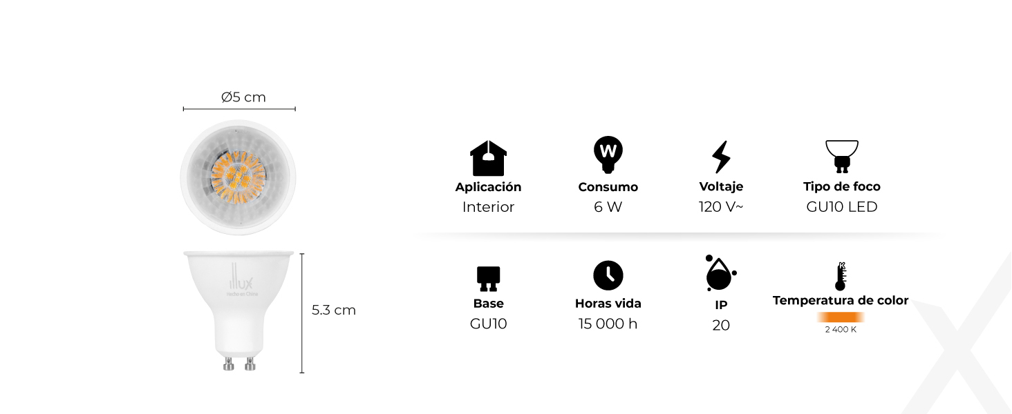 Uso:InteriorAplicación:LámparasMontaje:SobreponerTipo:GU10Material:Plástico y AluminioDimesiones:50 mm, 53 mmIP:20Peso:0.26 kgTipo de lámpara:GU10 LEDBase:GU10Corriente:0.06 AFrecuencia:60 HzTemperatura de operación:-20 °C a +45 °CTensión:120 V~Tecnología:LEDAcabado:BlancoAtenuable:TRIACHoras de vida:15000Factor de potencia:≥0.5Ángulo de apertura:38°Flujo real:450 lmPotencia:6 WTemperatura de color:2 400 KClave Producto Servicio:39111500Clave Unidad:H87Unidad:Pieza -
