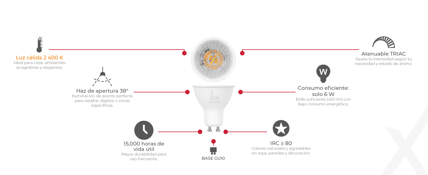 Con una potencia de 6W y un flujo luminoso de 450lm, esta lámpara proporciona una iluminación brillante y uniforme con un índice de reproducción cromática (IRC) de ≥80 y una temperatura de color de 2 400 K.