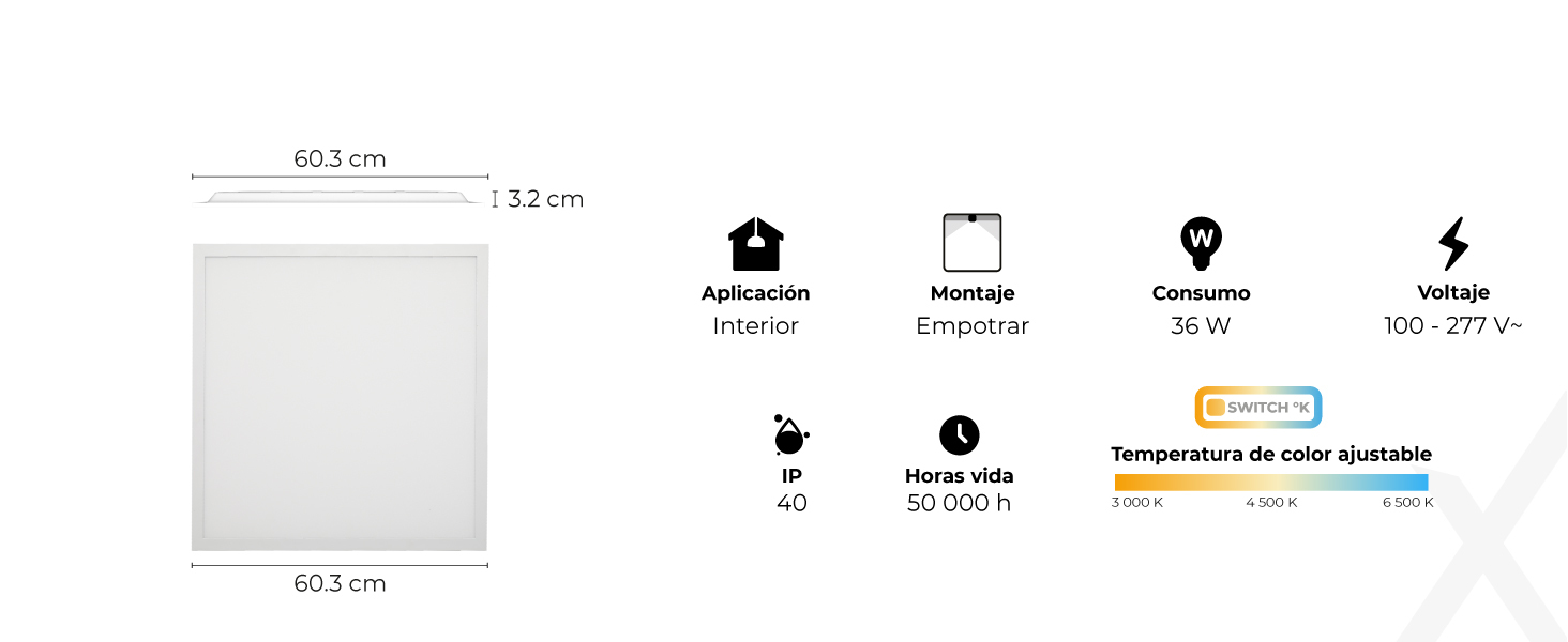 Uso:InteriorAplicación:TechoMontaje:Empotrar y SuspenderTipo:LED BACK LITE PANELMaterial:PMMA y Difusor de PSDimensiones:603 mm, 603 mm, 32 mmIP:40Peso:2.1 kgTipo de aislamiento:Clase IICorriente:0.36 - 0.12 AFrecuencia:50/60 HzTemperatura de operación:-20 °C a +45 °CTensión:100 - 277 V~Tecnología:LEDAcabado:BlancoAtenuable:NoHoras de vida:50000Lámpara:IncluidaArmónicas:<20 %Factor de potencia:<0.9Potencia:36 WÁngulo de apertura:112°Flujo real:3 000 K - 3 440 lm, 4 500 K 3 817 lm, 6 500 K 3 632 lmIRC:≥80Temperatura de color ajustable:3 000 K, 4 500 K, 6 500 KUGR:<19Clave Producto Servicio:39111500Clave Unidad:H87Unidad:Pieza -