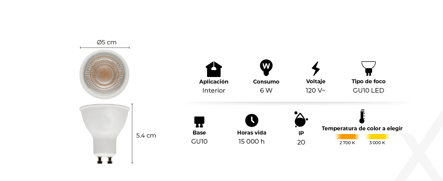 Uso:InteriorAplicación:LámparasTipo:GU10Material:PolicarbonatoDimensiones:54 mm, 50 mmIP:20Peso:0.03 kgBase:GU10Corriente:0.05 AFrecuencia:60 HzTemperatura de operación:-20 °C a +50 °CTensión:120 V~Tecnología:LEDAcabado:BlancoAtenuable:TRIACHoras de vida:15000Lámpara:IncluidaFactor de potencia:0.5Ángulo de apertura:38°Flujo real:500 lmIRC:90Temperatura de color:2 700 K y 3 000 KClave Producto Servicio:39112102Clave Unidad:H87Unidad:Pieza -