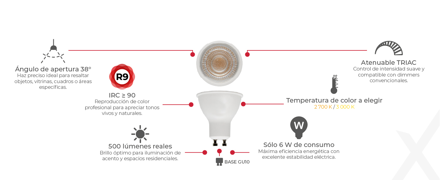 Esta lámpara GU10 LED ofrece una potencia de 6W y un flujo real de 500lm, brindando una iluminación brillante y eficiente energéticamente.