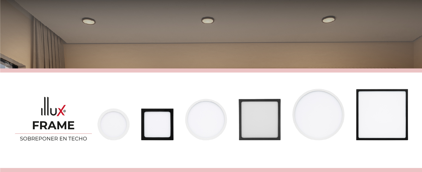 Con un formato cuadrado de 90x90 mm y un perfil de apenas 24 mm de altura, la familia FRAME ofrece una estética moderna y discreta. Su diseño de sobreponer es perfecto para techos de concreto o superficies donde no es posible empotrar, logrando una integración arquitectónica limpia sin sacrificar espacio.