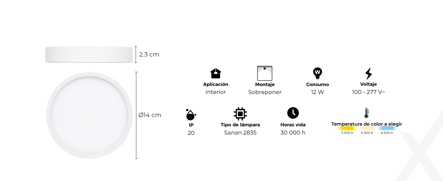 La luminaria LED de sobrepóner TL-2808 ofrece una potencia de 12 W, generando un impresionante flujo luminoso real de 959lm, que garantiza una iluminación brillante y uniforme en espacios interiores.