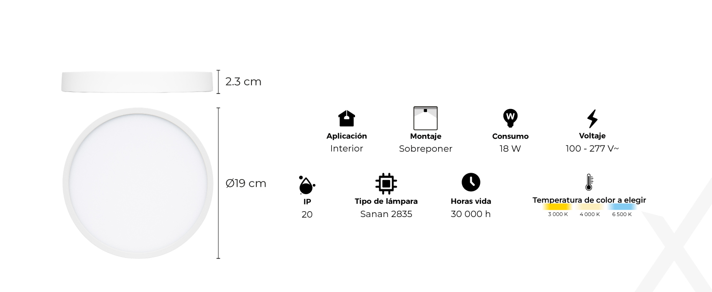 Con una potencia de 18 W y un flujo luminoso real de 1,427 lm, esta luminaria LED proporciona una iluminación excepcionalmente brillante y eficiente en interiores, asegurando una visión clara y cómoda.