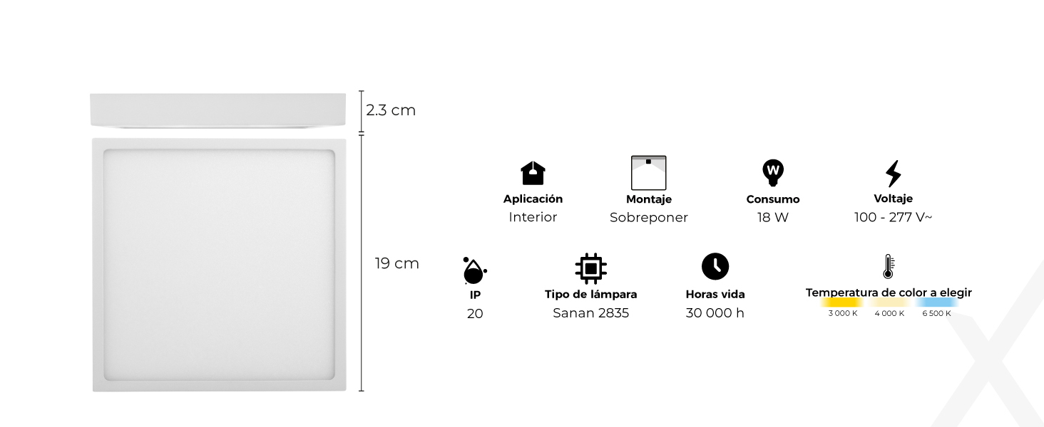 Uso:InteriorAplicación:TechoMontaje:SobreponerTipo:DownlightMaterial:Aluminio y PlásticoDimensiones:190 mm, 190 mm, 23 mmIP:20Peso:577 grmsTipo de aislamiento:Clase IITipo de lámpara:Sanan 2835Driver:Incluido (externo)Corriente:0.18 - 0.06 AFrecuencia:50/60HzTemperatura de operación:-20 °C a +50 °CTensión:100 - 277 V~Acabado:Blanco, NegroAtenuable:NoHoras de vida:30000Lámpara:IncluidaArmónicas:>20Factor de potencia:>0.9Ángulo de apertura:120°Flujo real:1 427 lmPotencia:18 WIRC:>80Temperatura de color:3 000 K, 4 000 K, 6 500 KClave Producto Servicio:39111500Clave Unidad:H87Unidad:Pieza -