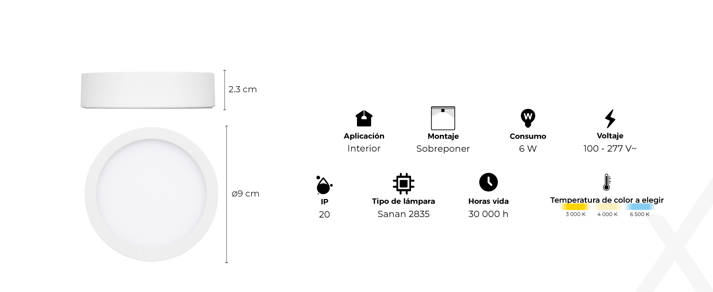 Fabricada con materiales de alta calidad, esta luminaria presenta un acabado en blanco o negro y un diseño delgado con un diámetro de 90 mm y un perfil bajo de 23 mm, lo que la hace ideal para aplicaciones en interiores, incluyendo residencias, hoteles, restaurantes, salas de estar y recibidores.