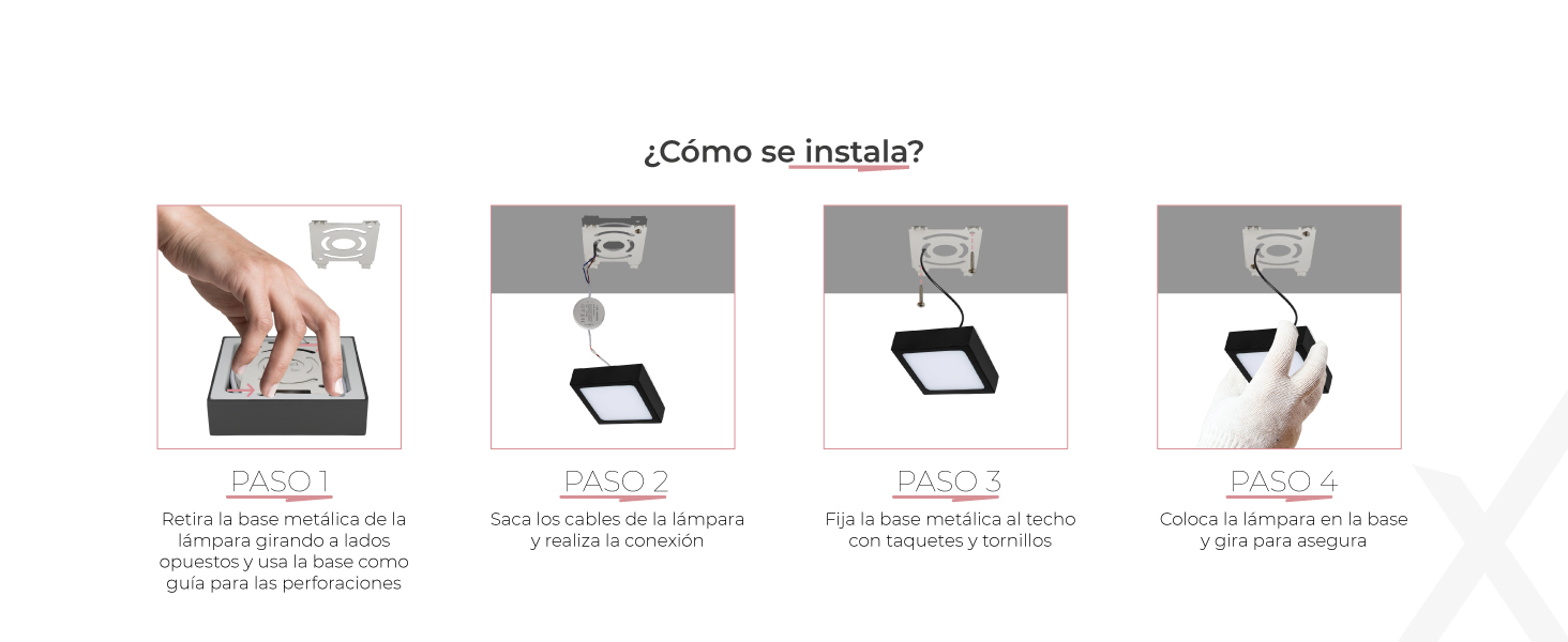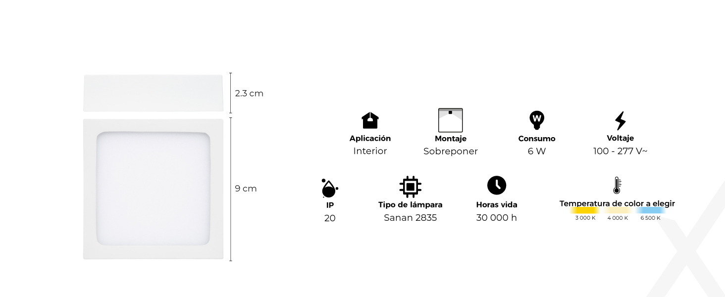 La luminaria LED de sobrepón cuadrada TL-2807 ofrece un rendimiento excepcional con un consumo de solo 6 W, brindando un flujo luminoso real de 425 lm y un factor de potencia superior a 0.9, lo que asegura una iluminación eficiente y económica.
