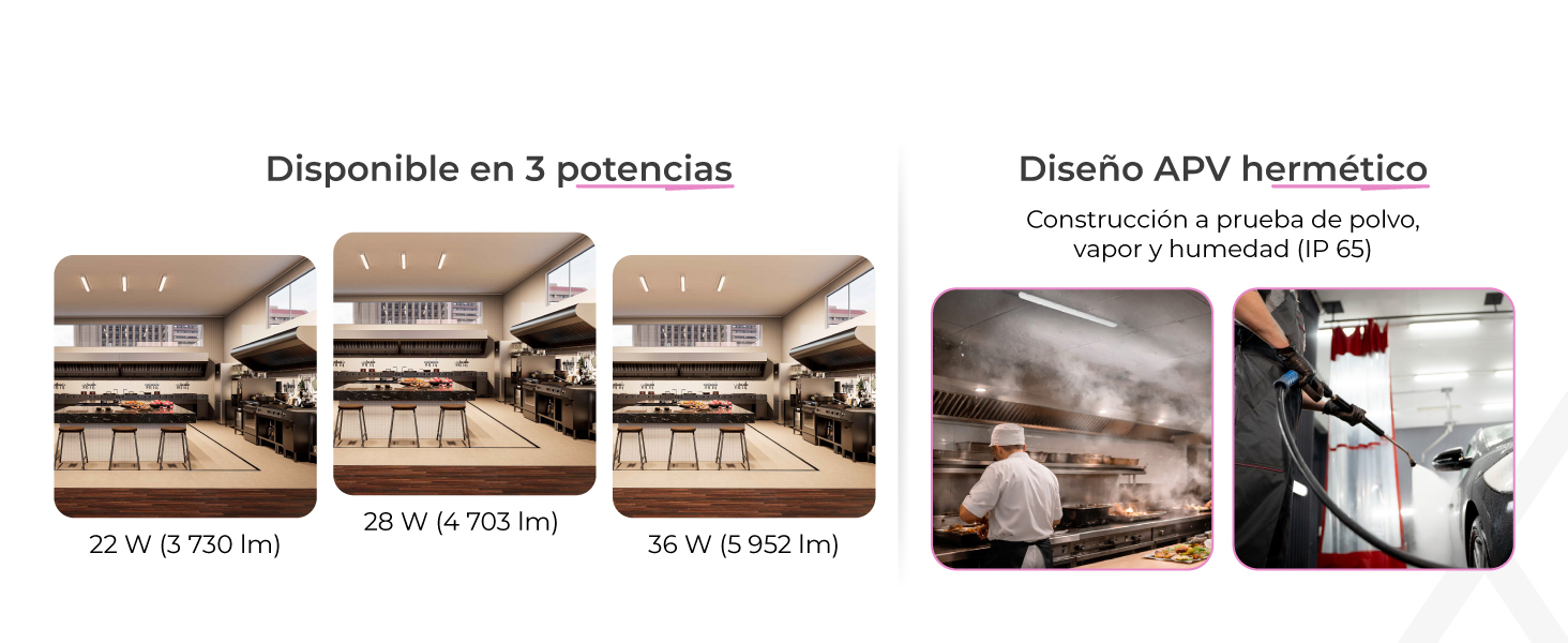 Integra un sistema de selección que permite ajustar la potencia entre 22W, 28W y 36W, adaptándose a diferentes alturas, niveles de iluminación y requerimientos energéticos sin cambiar de modelo.