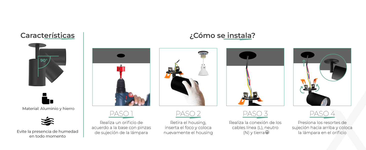 Con un diámetro de corte de Ø 45 mm, esta luminaria se empotra de manera sencilla y discreta en techos. Sus dimensiones de 88mm de largo, 60mm de ancho y 85mm de alto la hacen adecuada para diversas aplicaciones y configuraciones.