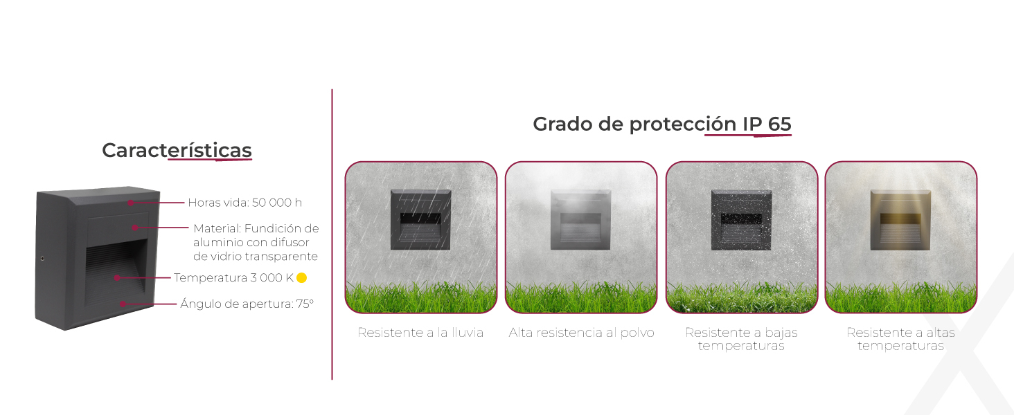 Dimensiones de 9 x 9 x 3.6 cm y peso de solo 200 g. Perfecta para fachadas, jardines, entradas y zonas exteriores donde se requiera iluminación focal.