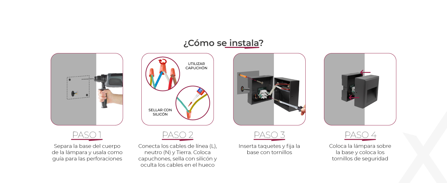 Montaje tipo sobreponer en muro, con aislamiento Clase I y driver integrado. Funciona con voltajes entre 100–277 V~ y frecuencia de 50/60 Hz.