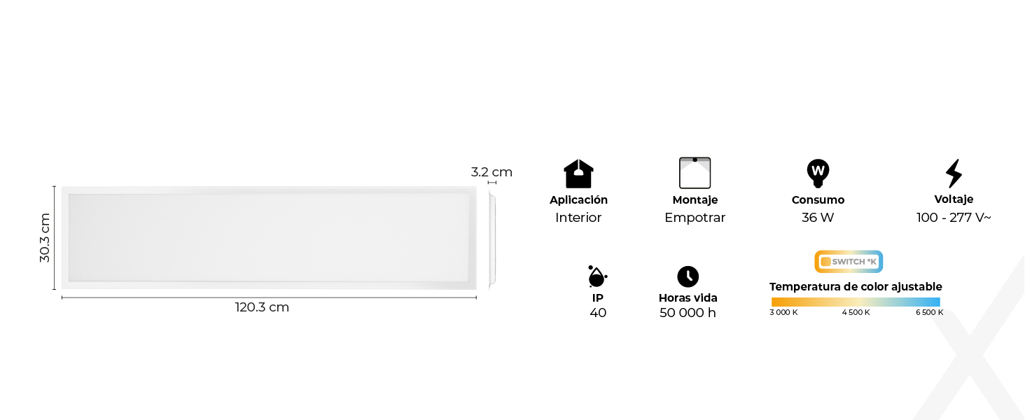 Acabado:BlancoMaterial:Difusor de PS, PMMAMontaje:Empotrar, SuspenderDimensiones:303x1203x32 mmIP:40IK:02Peso:1.45 KgDriver:IncluidoLámpara:IncluidaTipo de aislamiento:Clase IITipo de lámpara:LED 2835 RunliteArmónicas:<10 %Corriente:0.36 – 0.12 AFactor de potencia:<0.9Frecuencia:50/60 HzPotencia:36 WTemperatura de operación:-20 °C a +45 °CTensión:100 – 277 V~Ángulo de apertura:112°Flujo real:3 000 K – 3 420 lm, 4 500 K – 3 960 lm, 6 500 K – 3 780 lmIRC:80Temperatura de color:3 000 K, 4 500 K, 6 500 KUGR:22 -