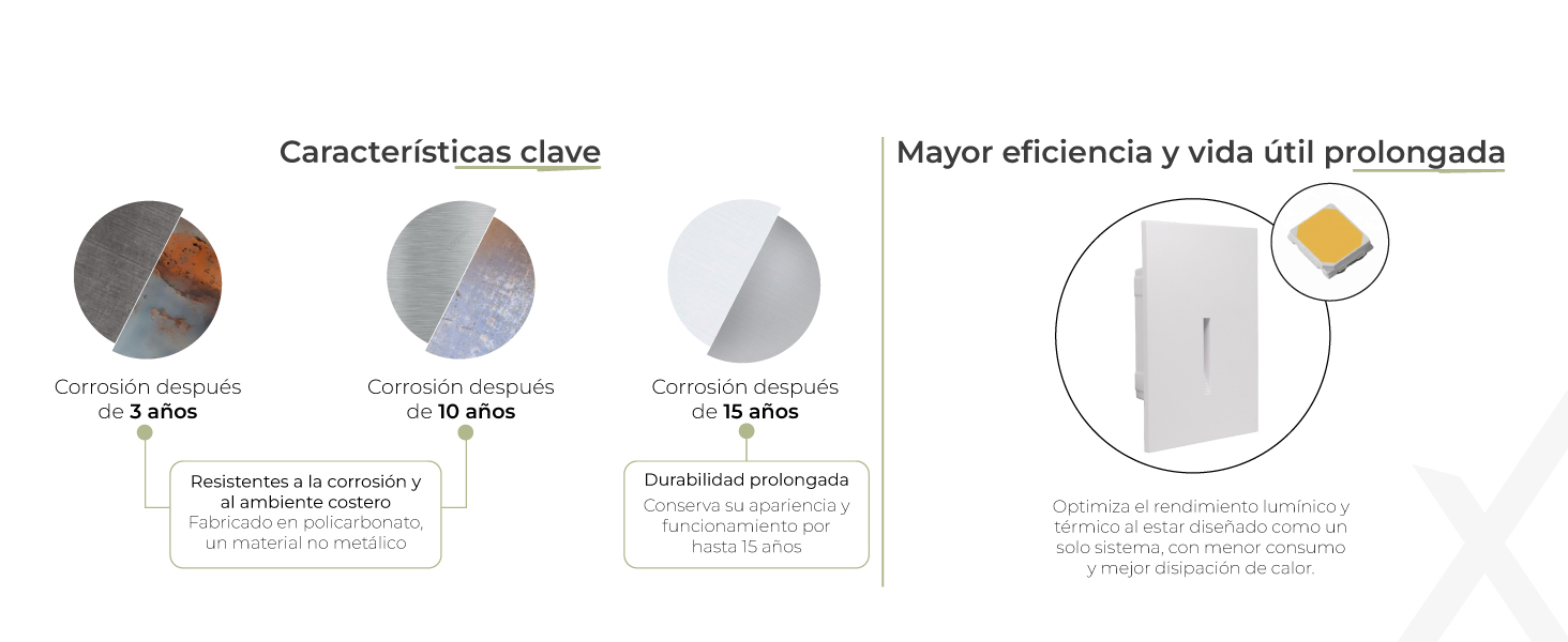 Cuerpo de policarbonato con clasificación IP65 e IK04, resistente al polvo, agua y golpes leves.
