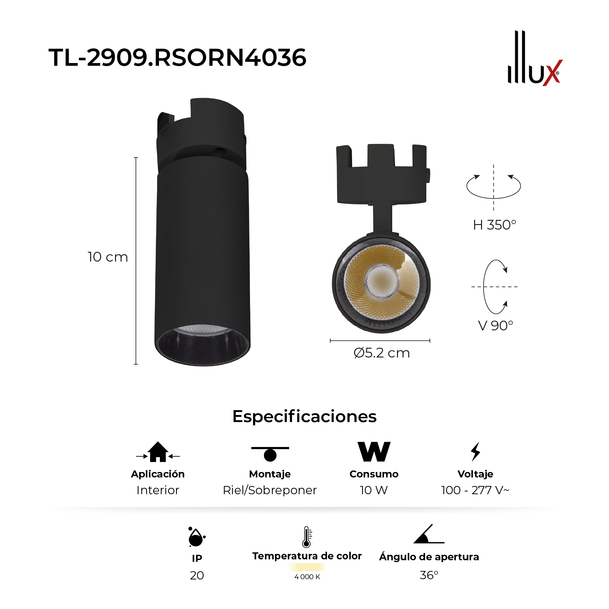 Acabado:Blanco, NegroMaterial:Aluminio, PolicarbonatoMontaje:Riel, SobreponerDimensiones:52×100 mmIP:20Peso:0.160 KgDriver:IncluidoHoras de vida:20 000 hLámpara:IncluidaTipo de aislamiento:Clase IITipo de lámpara:LED SANANCorriente:0.10 – 0.03 AFactor de potencia:>0.9Frecuencia:50/60 HzPotencia:10 WTemperatura de operación:-20 °C a +60 °CTensión:100 – 277 V~Ángulo de apertura:15°, 24°, 36°Consumo:0.01 KWhFlujo luminoso:869 lmIRC:≥90Temperatura de color:3 000 K, 4 000 K -