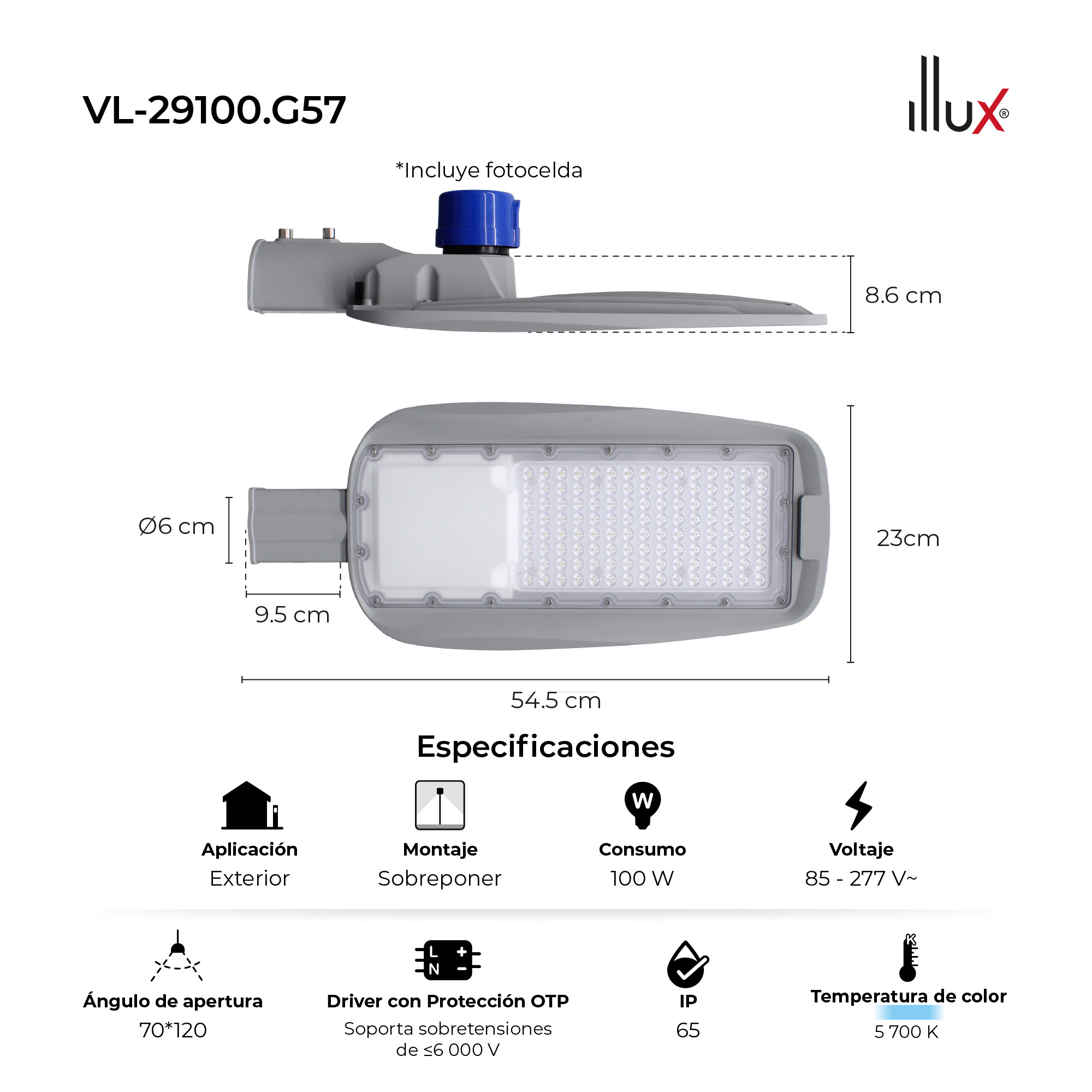 Emite un flujo luminoso real de 16,403 lm a 5,700 K, ideal para maximizar la visibilidad en zonas industriales, vialidades y espacios públicos.