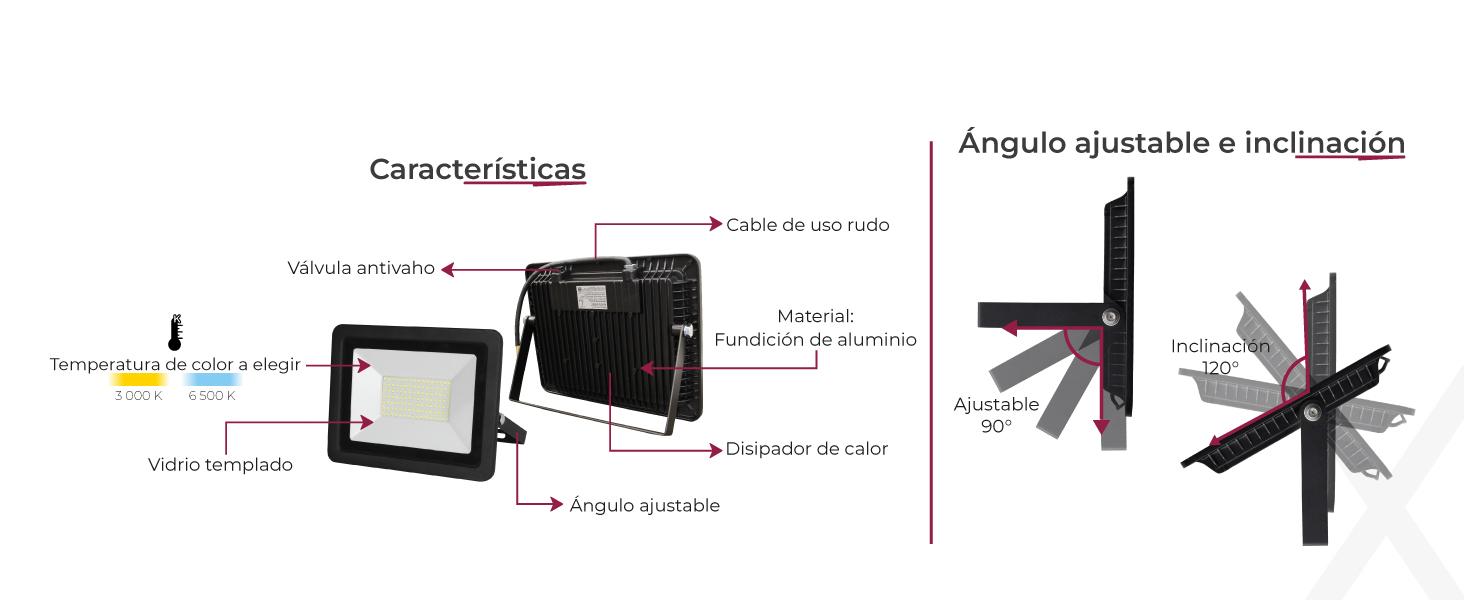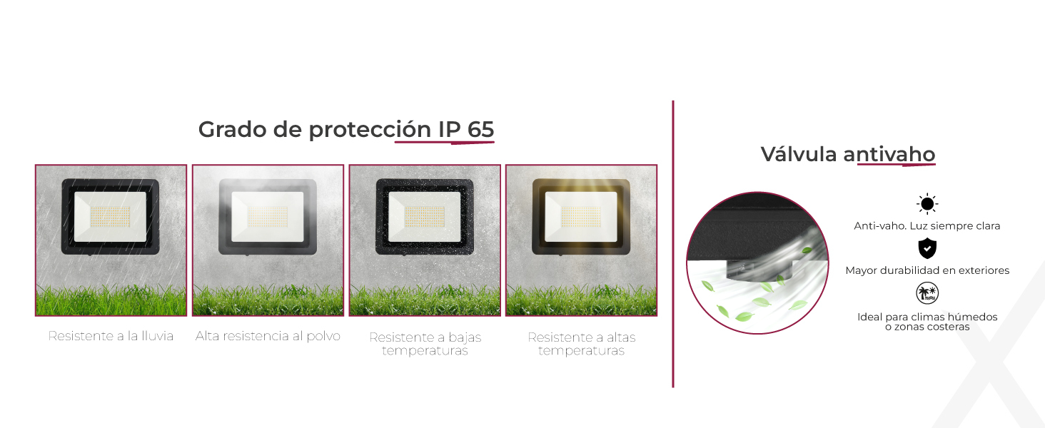 Fabricado en fundición de aluminio con vidrio templado, este reflector es apto para intemperie y cuenta con clasificación IP65. No importa si llueve o hace mucho calor, este reflector está diseñado para soportar las condiciones más adversas.