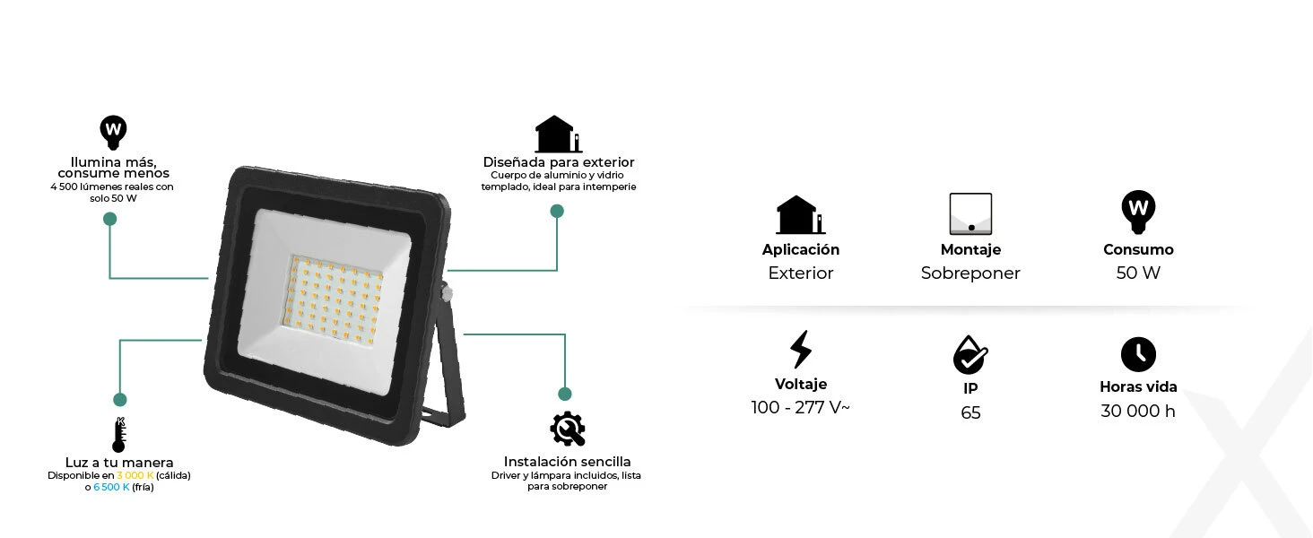 Con un equilibrio perfecto entre potencia y eficiencia, este reflector de 50 W ofrece un flujo luminoso de 4,500 lúmenes y un IRC superior a 80. Ideal para iluminar áreas medianas, proporciona una luz brillante y nítida que resalta los colores con fidelidad. Disfruta de una iluminación de calidad y rendimiento confiable en tus proyectos exteriores.