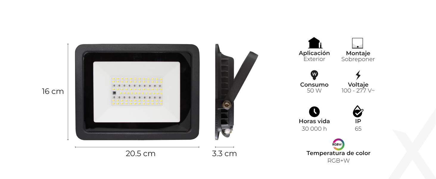 Acabado:NegroMaterial:Fundición de aluminioMontaje:SobreponerDimensiones:205x160x33 mmIP:65IK:05Peso:0.6 KgDriver:IncluidoHoras de vida:30 000 hLámpara:IncluidaTipo de aislamiento:Clase ITipo de lámpara:LED MBTC-2835Corriente:0.50 – 0.18 AFactor de potencia:0.9Frecuencia:50/60 HzPotencia:50 WTemperatura de operación:-20 °C a +40 °CTensión:100 – 277 V~Ángulo de apertura:120°Flujo real:Azul 17 lm/W, Blanco 139/W, Rojo 39 lm/W, Verde 70 lm/WIRC:≥00Temperatura de color:6 500 K, RGBW -