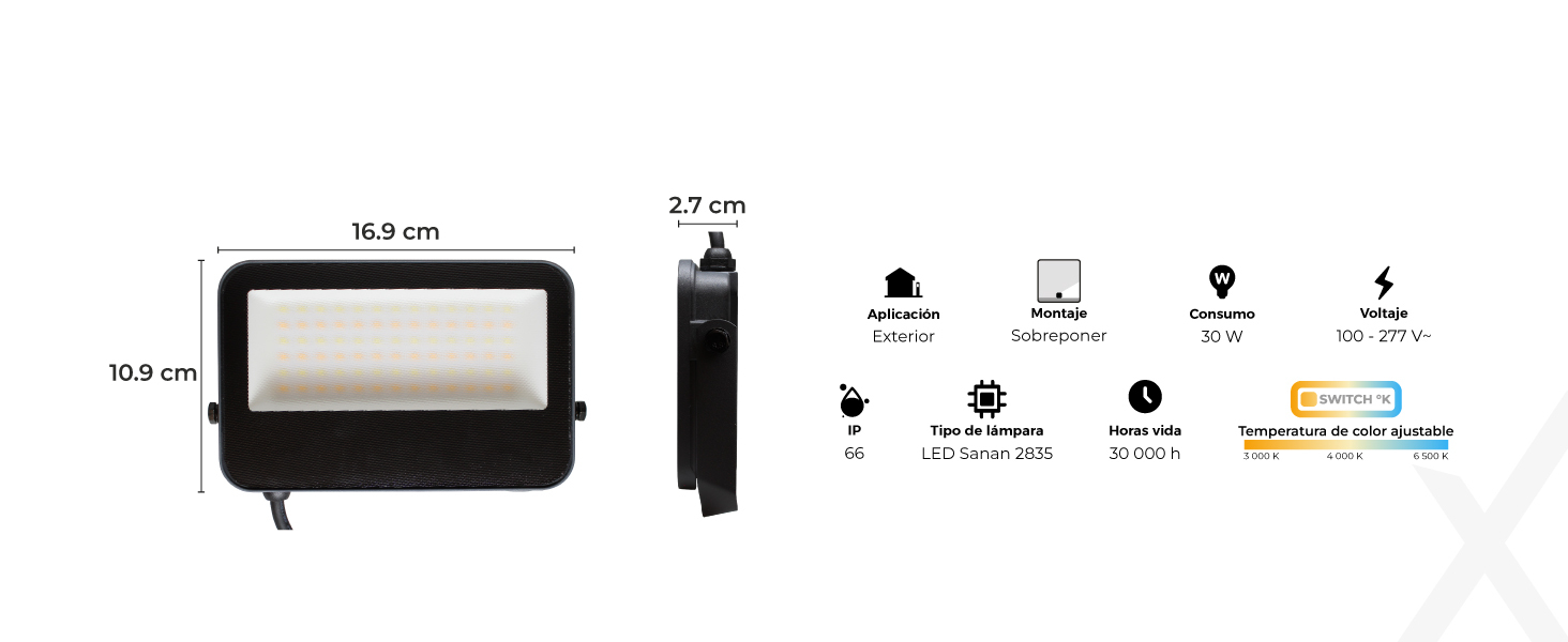Con una potencia de 30W, este reflector entrega hasta 3 600 lúmenes, proporcionando una iluminación intensa y eficiente con un ángulo de apertura de 120°, ideal para cubrir áreas más amplias en exteriores.