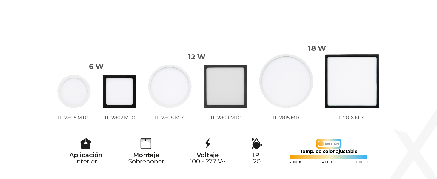 Su tamaño de 190x190 mm ofrece una mayor superficie de emisión de luz, lo que reduce las sombras y mejora la distribución lumínica en el espacio. Con un perfil ultra delgado de solo 24 mm, mantiene una apariencia minimalista y moderna que se integra perfectamente al sobreponerse en cualquier techo.