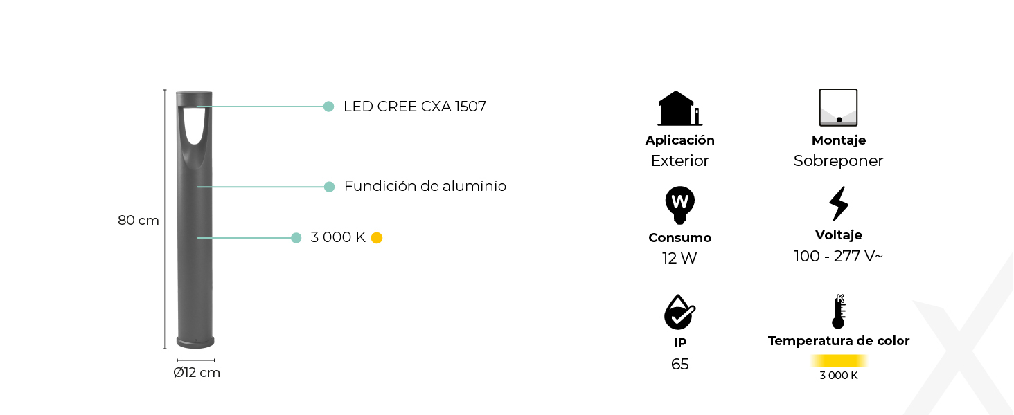 Uso:ExteriorAplicación:PisoMontaje:SobreponerTipo:PosteMaterial:Fundición de aluminioDimensiones:108 mm, 120 mm, 800 mmIP:65Tipo de lámpara:LED CREE CXA 1507Corriente:0.12 - 0.04 AFrecuencia:50/60 HzTemperatura de operación:-30 °C a + 45 °CTensión:100 - 277 V~Acabado:GrisAtenuable:NoLámpara:IncluidaPotencia:12 WFlujo real:650 lmIRC:>80Ángulo de apertura:180°Temperatura de color:3 000 KClave Producto Servicio:39111600Clave Unidad:H87Unidad:Pieza -